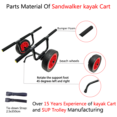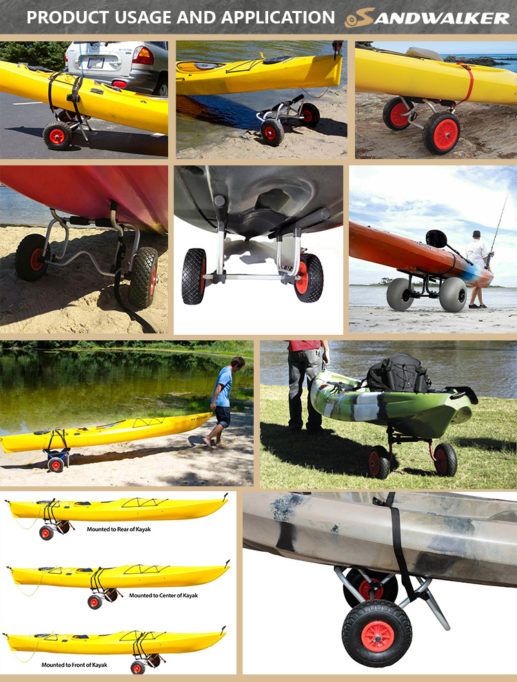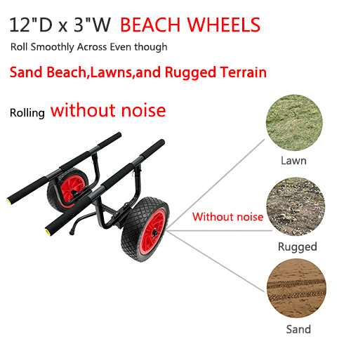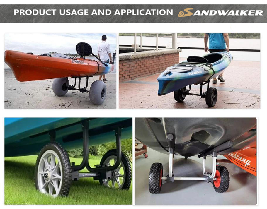 Twee strandwielen voor gemakkelijke mobiliteit: onze kajakkar-dolly is uitgerust met twee strandwielen die speciaal zijn ontworpen om gemakkelijk over zacht zand te rollen. Deze robuuste wielen zorgen voor soepele mobiliteit, zelfs op uitdagend terrein.