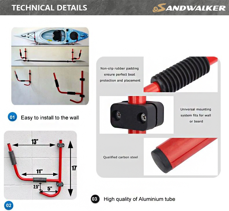 Zware aluminium constructie en rubberen vulling: deze haken zijn gemaakt van robuust aluminium en zijn gebouwd om het gewicht van uw kajak te weerstaan en tegelijkertijd een lange levensduur te garanderen. De duurzame rubberen vulling op de wiegen biedt uitzonderlijke bescherming en voorkomt krassen en schade aan uw kajak tijdens opslag.