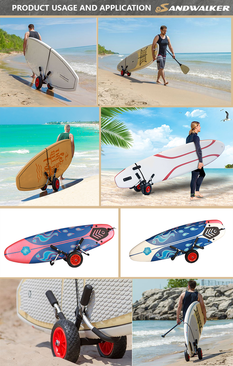 Stabiele ondersteuning met grote pneumatische wielen: De Sup Transport Trolley is uitgerust met grote 10 inch pneumatische wielen die stabiele ondersteuning bieden, zelfs op oneffen terrein. Deze wielen zijn speciaal ontworpen om door uitdagende ondergronden te navigeren, zoals zandgebieden. Met hun pneumatische ontwerp absorberen ze schokken en stoten, waardoor een soepele en stabiele transportervaring voor uw SUP-board wordt gegarandeerd.