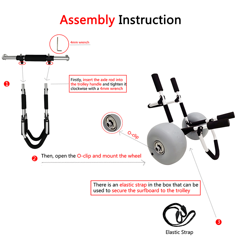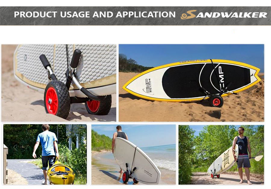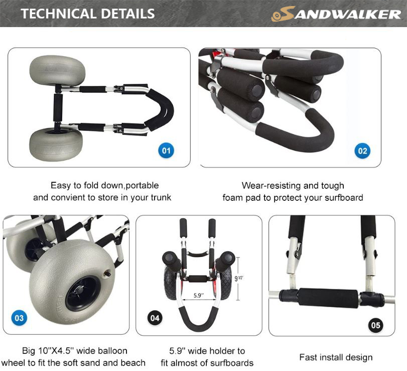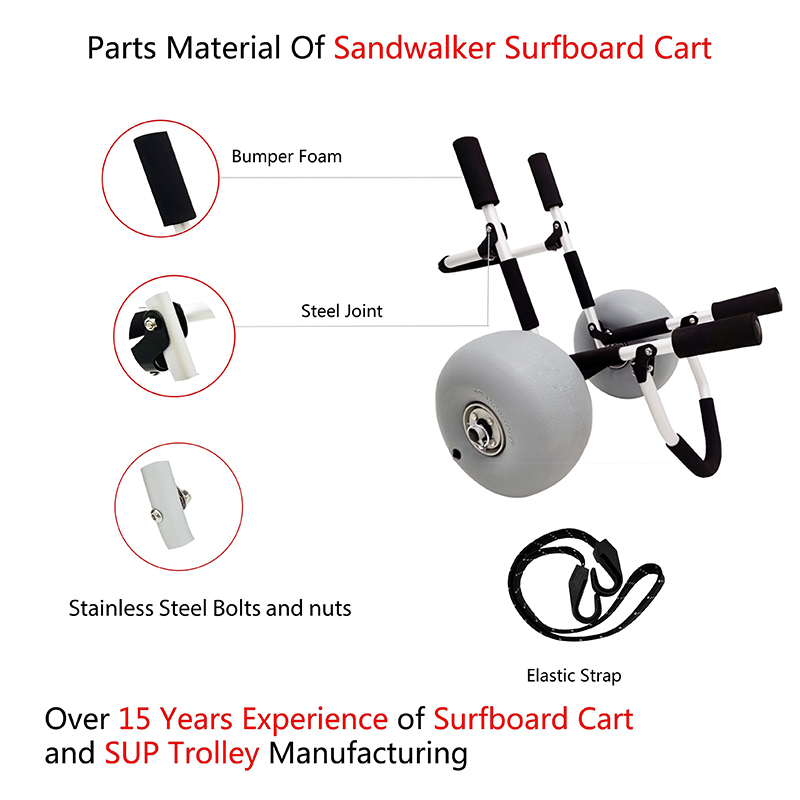 Veilig en beschermd transport: de strandwagen is voorzien van nylon plastic onderdelen, bungee-bevestigingen en schuimrubberen stootkussens, allemaal ontworpen om uw surfplank veilig en beschermd te houden tijdens transport. De combinatie van deze eigenschappen zorgt ervoor dat je surfplank in uitstekende staat blijft, vrij van krassen of beschadigingen door beweging of stoten.